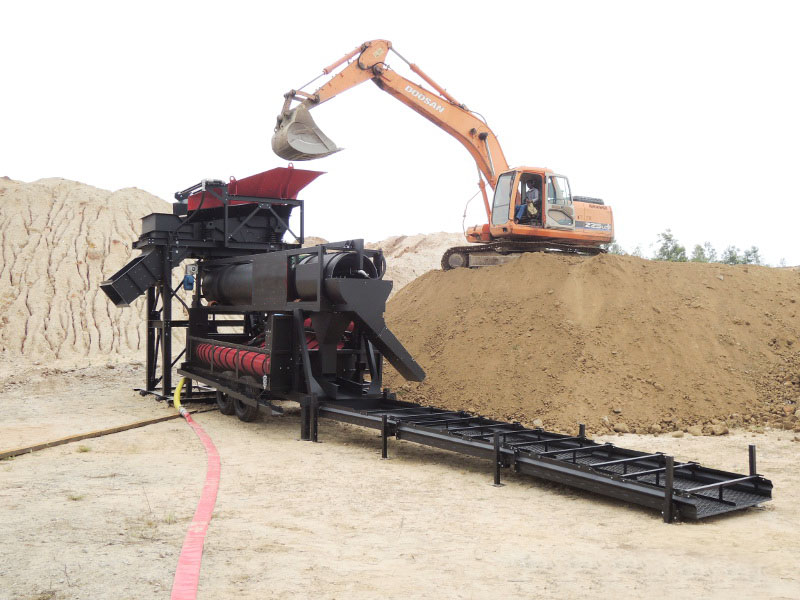 可采用挖掘機(jī)、鏟車、輸送機(jī)上料、也可定制為沙泵或翻斗車上料的料斗。料斗可配套格篩,將大石塊廢料隔出,以免對篩造成傷害。料斗可配套振動給料機(jī)、使礦料在進(jìn)入滾筒式均勻、不間斷。小型淘金設(shè)備
