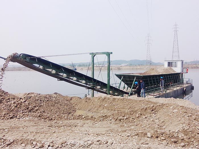 主要工作過程為:挖沙設備采集原料,輸送到運輸船儲料倉,然后經(jīng)過運輸船到岸邊,用輸送帶輸送到陸地上。