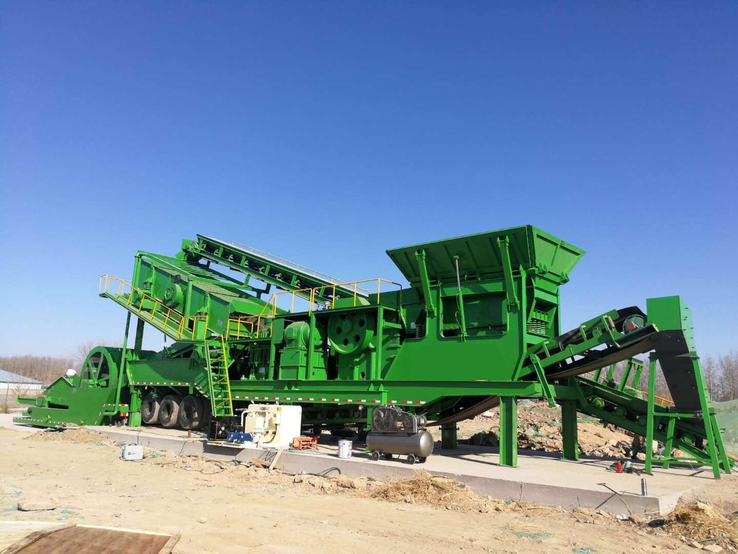 移動制砂洗沙設(shè)備,半移動破碎站,掛上車頭就可跑,方便快捷