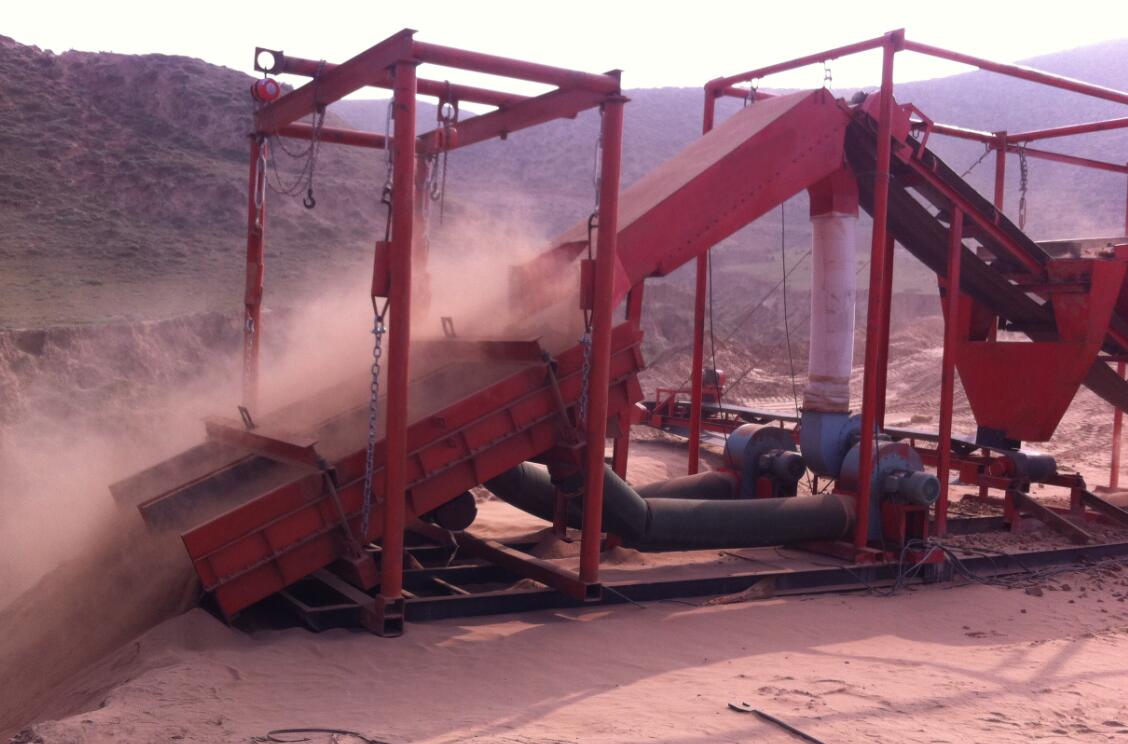 該設(shè)備是利用了風(fēng)吹代替了水沖,利用風(fēng)吹所產(chǎn)生的渦流代替了離心機(jī)的離心力,在風(fēng)力的作用下使比重輕的物料產(chǎn)生輕微的懸浮,并在外界物理所產(chǎn)生的動力下使比重大的物料(如:金、鉑、鎢等)沉降,已達(dá)到與沙石料分離和富集回收,沙石料在風(fēng)壓和機(jī)械鼓動的作用下被帶走。