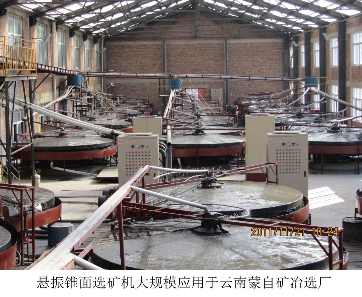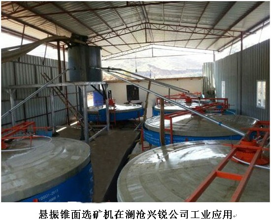 懸振錐面選礦機(jī)”是依據(jù)拜格諾剪切松散理論和流膜選礦原理研制而成的新型微細(xì)粒重選設(shè)備。當(dāng)攪拌均勻的礦漿從分選錐面的給礦器進(jìn)入盤面初選區(qū)時(shí),礦漿流即成扇形鋪展開向周邊流動,在其流動過程中流膜由厚逐漸變薄,流速也隨之逐漸降低。